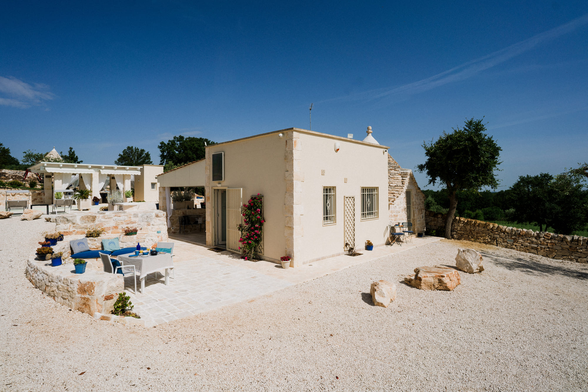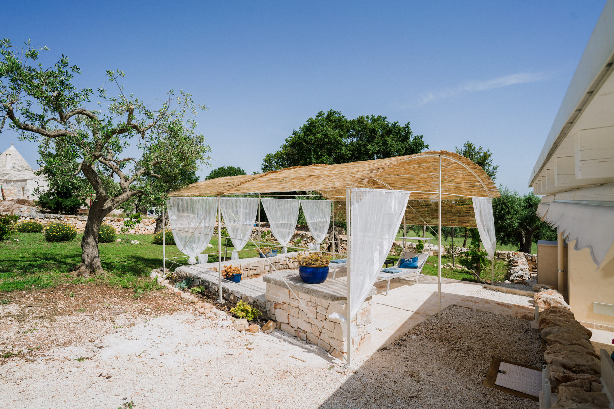 Benvenuti al Trullo del Benessere, un'oasi di emozioni e autenticità nel cuore della magnifica Valle d'Itria, a soli 2 km dal suggestivo centro di Alberobello, Patrimonio dell'Umanità UNESCO. Lasciatevi trasportare in un'esperienza di vacanza indimenticabile, dove il fascino antico si fonde armoniosamente con il comfort moderno. Il nostro Trullo tradizionale e la sua affascinante dependance vi accolgono in un abbraccio di tradizione e raffinatezza. Esplorate la magia dei nostri spazi esclusivi, immersi in un terreno di 2500 m2 di pura serenità, circondati da ulivi secolari, alberi da frutto e profumati campi di lavanda e rosmarino. Qui, la privacy è assicurata, permettendovi di rilassarvi nella quiete della campagna pugliese, godendo della piscina privata e dei momenti di dolce far niente sulla terrazza ombreggiata. All'interno del Trullo, respirerete un'atmosfera autentica, dove ogni pietra racconta storie antiche e ogni dettaglio è curato con amore per garantirvi un soggiorno indimenticabile. Pur mantenendo il suo carattere tradizionale, il Trullo offre tutti i comfort moderni, dalla cucina completamente attrezzata al bagno raffinato, fino alla connessione Wi-Fi che vi accompagnerà ovunque. Scoprite le meraviglie della Valle d'Itria e dei suoi borghi incantati, da Locorotondo a Ostuni, da Cisternino a Martina Franca, esplorando le strade ricche di storia e tradizione. Deliziate il palato con i sapori autentici della cucina pugliese, imparando i segreti delle orecchiette in un laboratorio di cucina locale, e lasciatevi tentare dagli affascinanti sentieri che attraversano la campagna, regalandovi panorami mozzafiato e tramonti indimenticabili. E quando desiderate abbracciare il mare, le spiagge incantevoli del Mare Adriatico vi attendono a soli trenta minuti di distanza, offrendovi giornate di puro relax e avventure costiere da Monopoli a Polignano a Mare. Benvenuti in un viaggio di emozioni, sapori e scoperte nella meravigliosa terra della Puglia, dove ogni momento è un tesoro da vivere appieno.